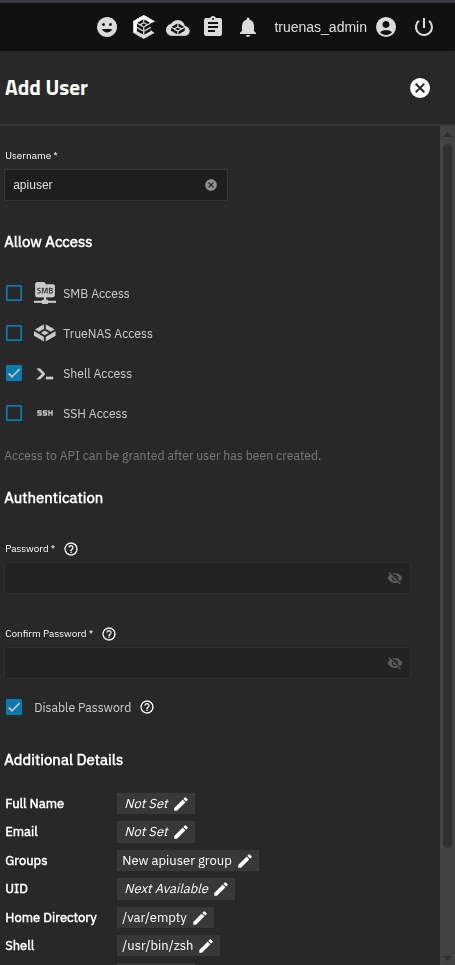Creation of a new user has multiple items. Shell access is required for API function, although it is noteworthy that this is not SSH access. TrueNAS will let you make an API key without shell access enabled for an account, and it won’t work. A password can be set, but it is advised to leave it disabled for security reasons.