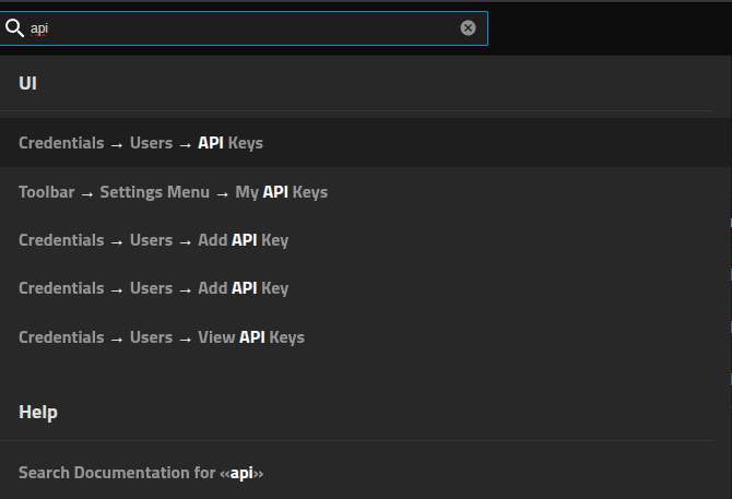 After this is done it is time to create the API keys. There are a few ways to access the API key menu, the easiest is to probably just search for API and go to Credentials->Users->API Keys although you can click through to the menu by opening up a user then clicking on the “API Keys” option.