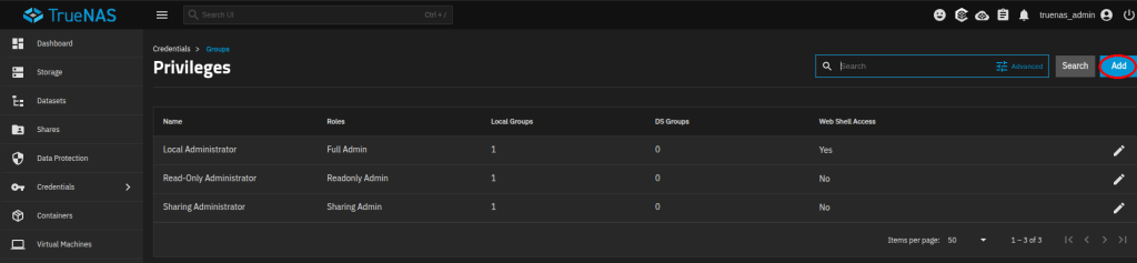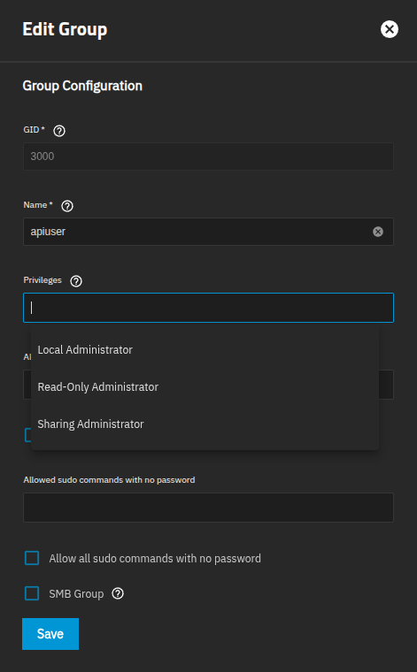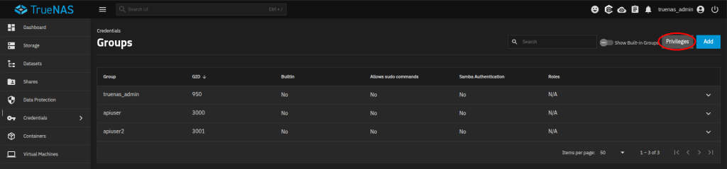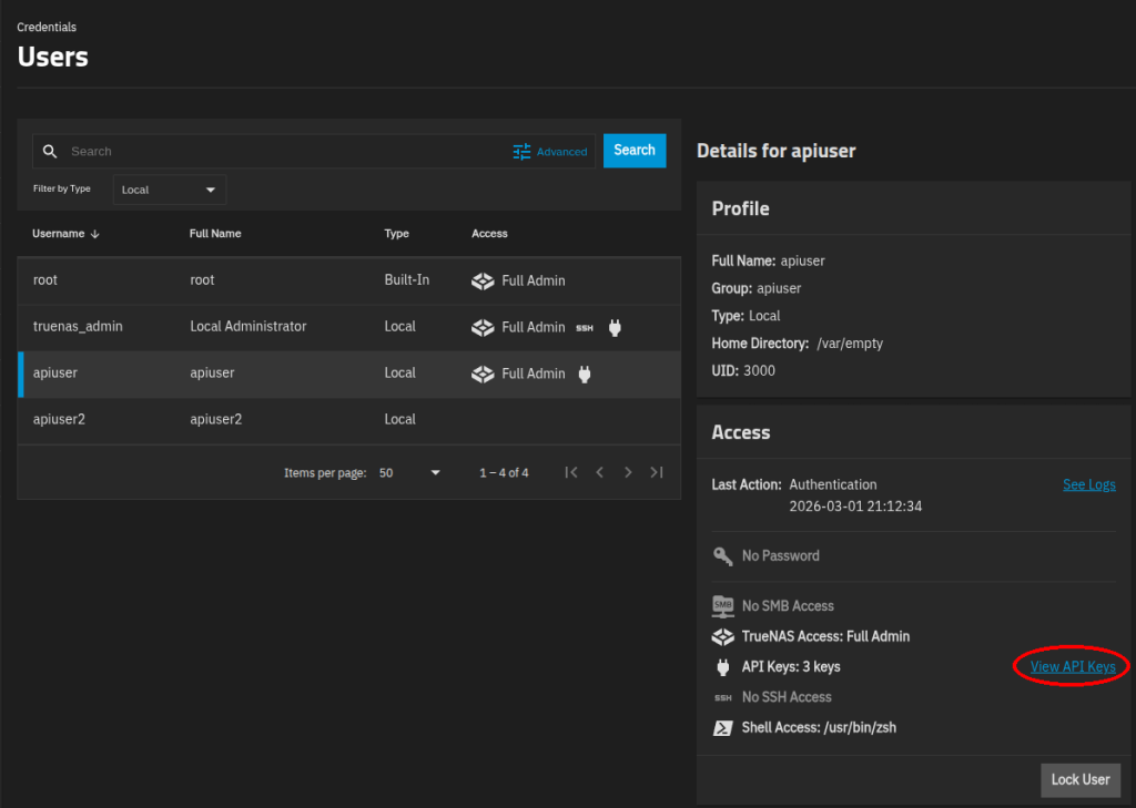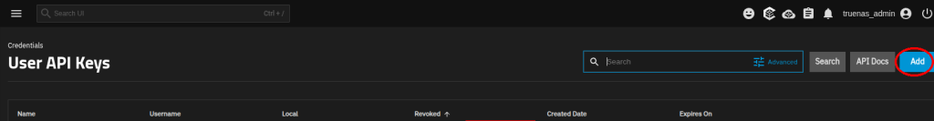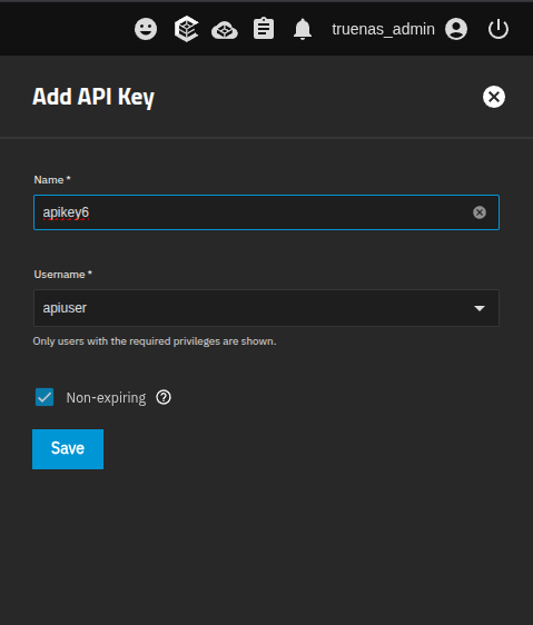 To run API based commands, a user must have an API key created against it. truenas_admin can be used for this, however there are key reasons not to. The first reason is that it is better to create a key for every interaction source for logging reasons. The second is that access can be limited for certain functions. As an example, a monitoring system should not be provisioning storage and doesn’t need read-write access.