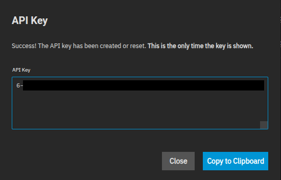 After confirming options, the key will be presented. As the notes say, this is the only time this key will be shown. If the key is lost, it will have to be regenerated via the “Reset” option. The number at the beginning is the number of API keys that have been generated.