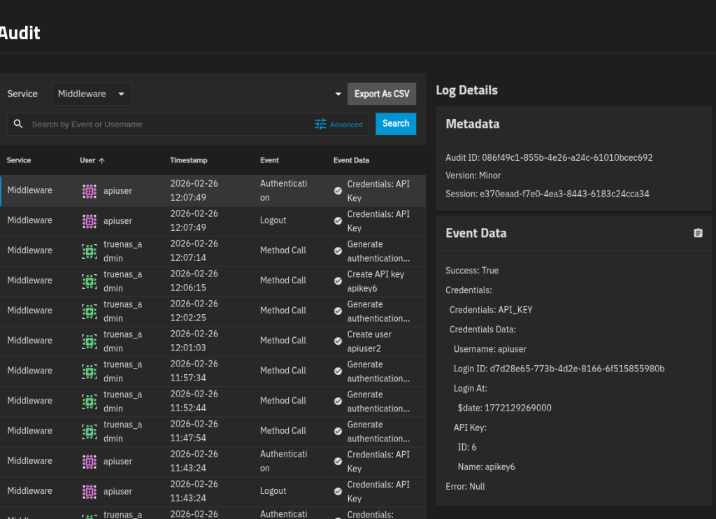 The audit logs for the API user show that a login event happened. One thing I will say is that the logs don’t show the action taken on the system, nor is there a readily apparent way to enable it. /var/log/nginx.log seems to have some of the calls in it in a limited aspect, but nothing clearly consistent that can be tailed.