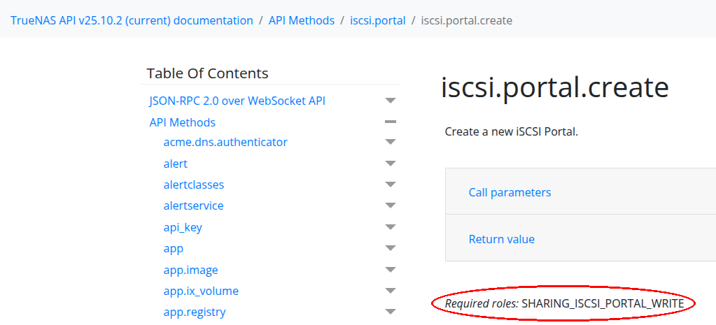 One of the nice things I can say about the documentation is it includes the roles that are required for a method within the page of that method. The example above is for the iscsi.portal.create method. There is a lot of granularity, which more advanced users in production environments will appreciate.