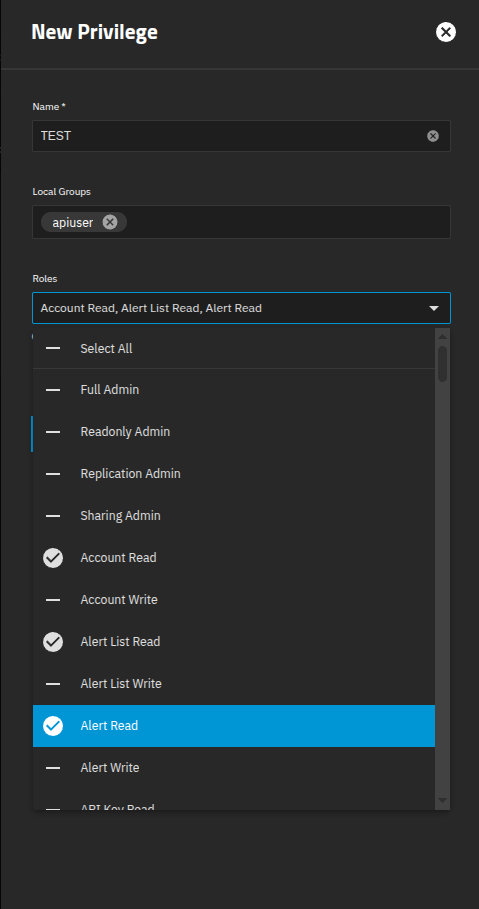 Within the menu give a name. Assigning a local group is optional, and can be done from within the group later or done at user creation if a new group is created for that user. Check the desired roles, then confirm the selection. Due to this being a non-production system, a default administrator role will be used in this post.