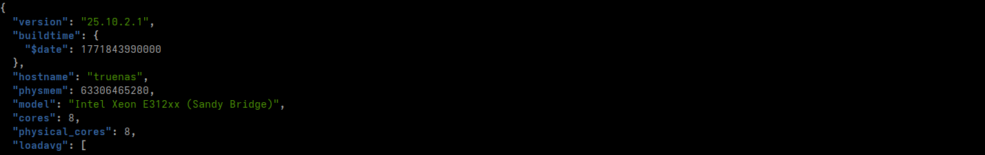 This doesn’t look like code! Yeah, I’m kind of cheating here. For a test this is more than good enough, and for a lot of sysadmins this will also be an adequate way of interacting with the API. Going into midclt it’s a wrapper for calling API functions. In my system this returns nulls, because I’m using passed through disks. jq is used to make the formating human readable instead of a jumbled mess.