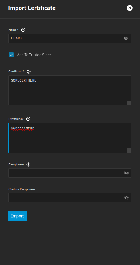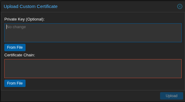 Just paste in the key and go like with TrueNAS. I will say that looking at my cert, I am not running an intermediate cert and it’s working fine. Your mileage may vary. If you need an intermediate cert, the top of the chain should be the cert its self and then the second cert should be the ca.crt file from SUBCA01’s /etc/easy-rsa/SUBCA01/pki/.