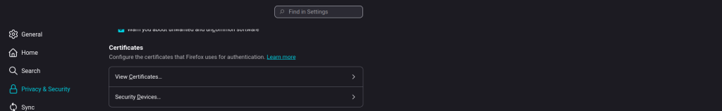 This example is for Firefox. From the settings menu, go to Privacy & Security. Under Certificates, click the arrow to the right of View Certificates.